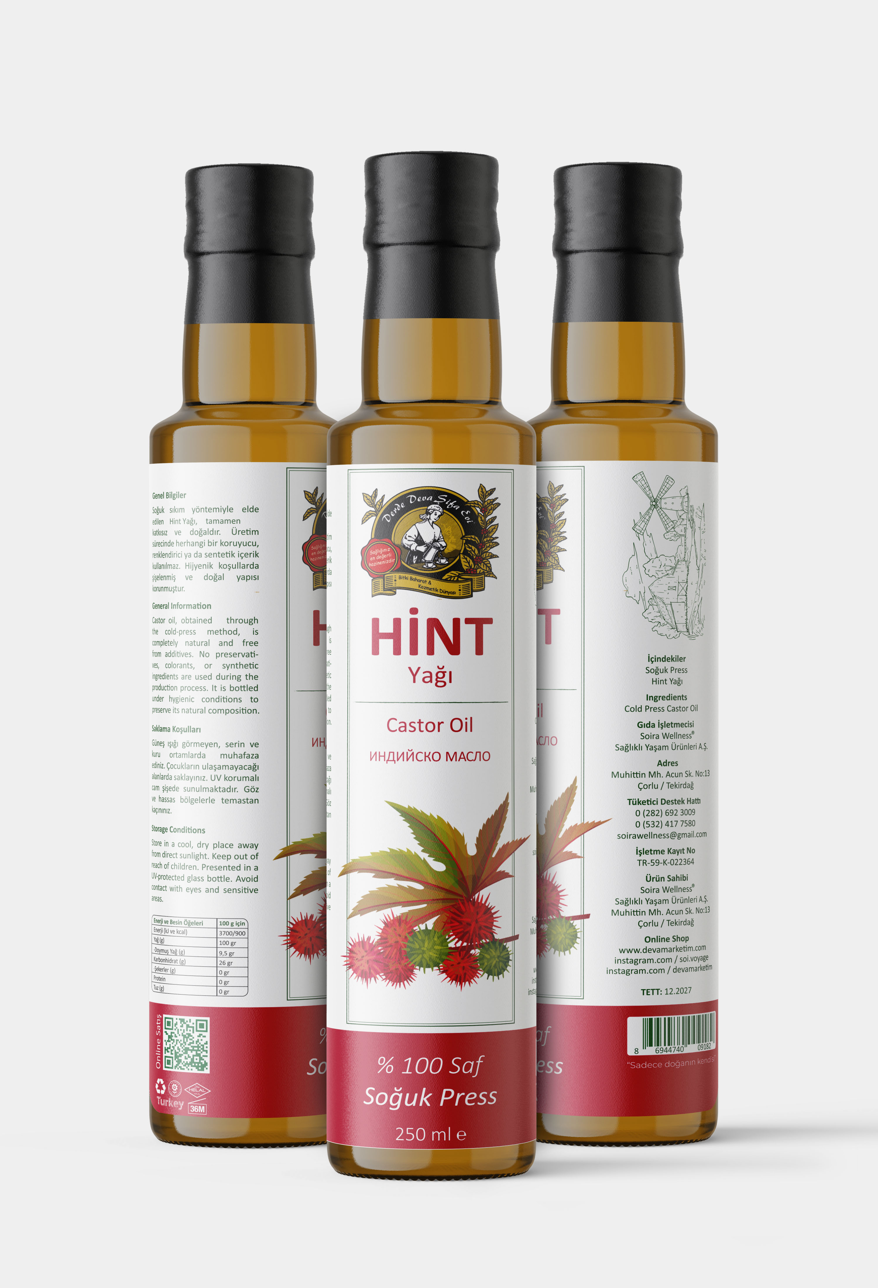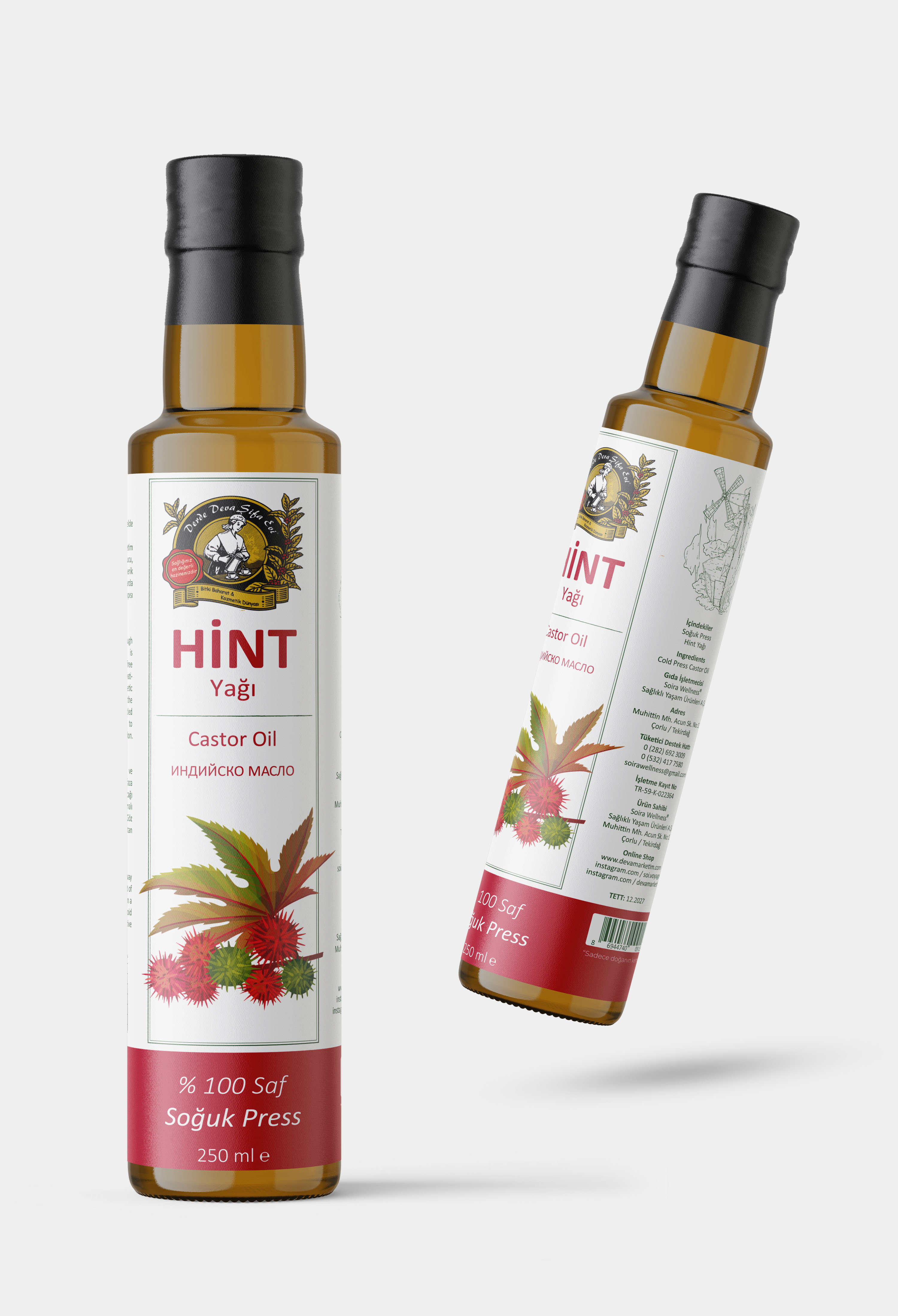 Hint yağı, soğuk sıkım yöntemiyle elde edilmiştir. Ürün, katkı maddesi, koruyucu veya sentetik bileşen içermez ve saf doğal formülüyle üretilmiştir. Yüksek kalite standartlarına uygun olarak üretilmiştir.