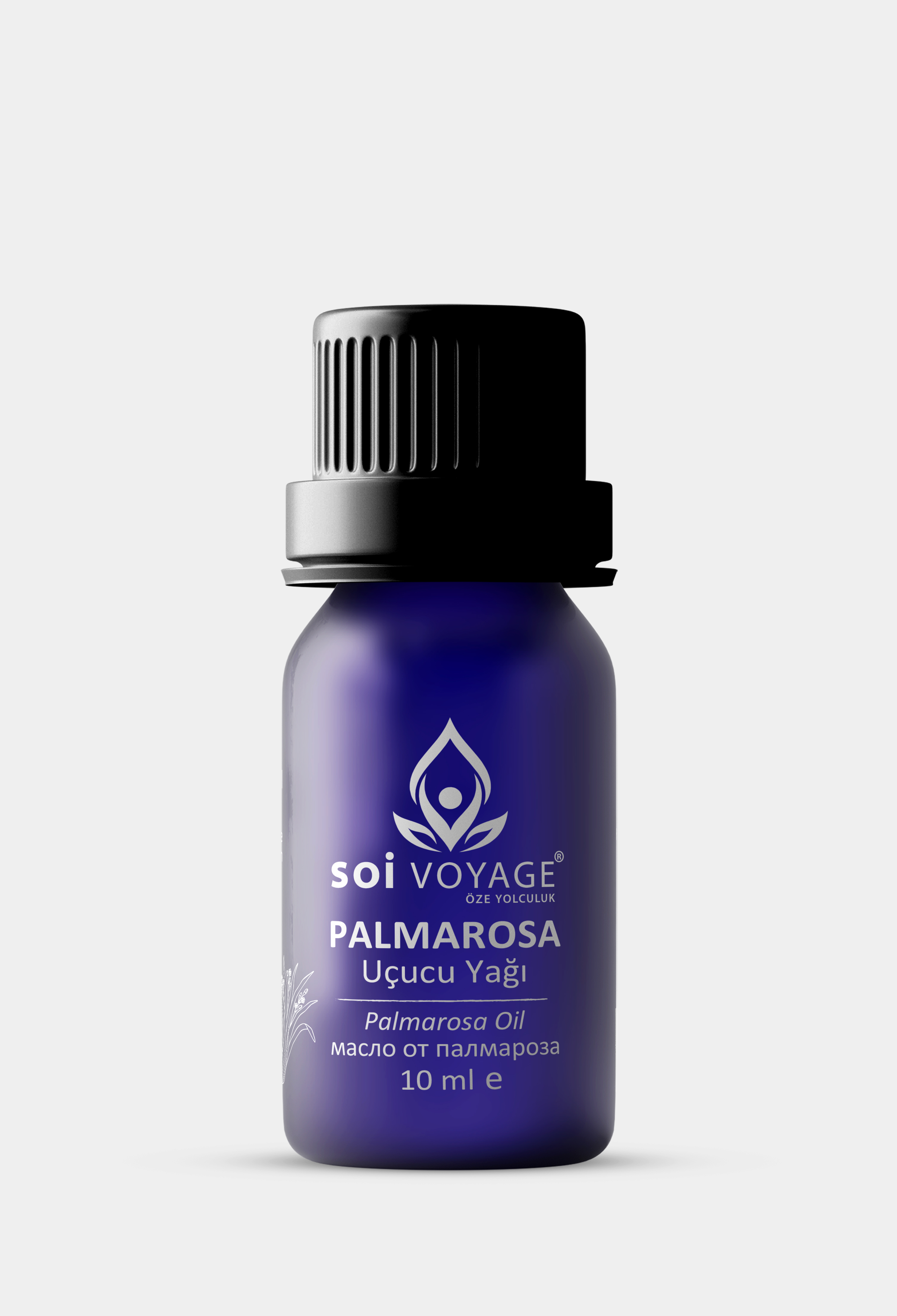 Soi Voyage'ın Palmarosa Uçucu Yağı, dengeli ve tatlı kokusuyla aromaterapide zihni yatıştırır, bakım ürünlerine doğal ferahlık katar.